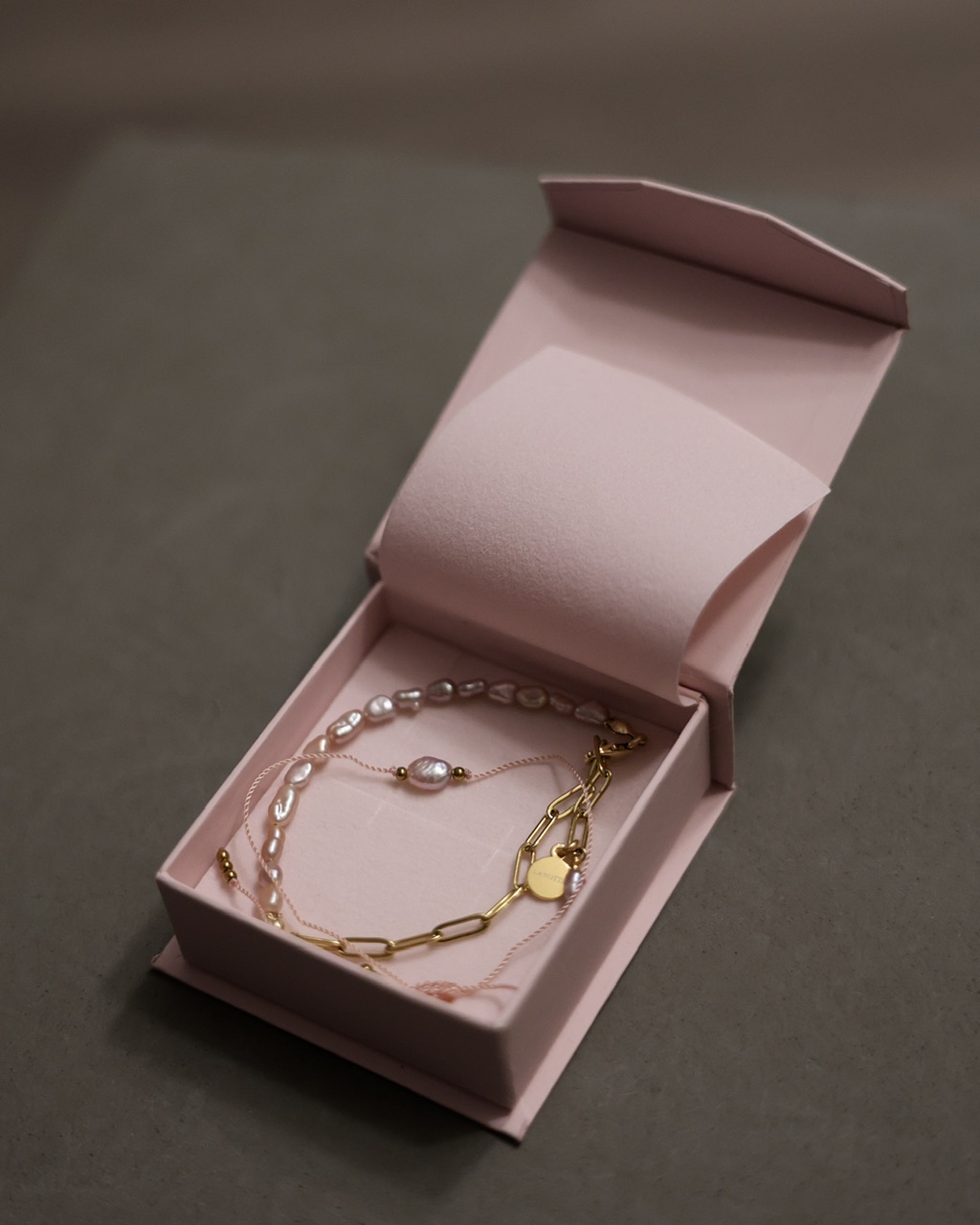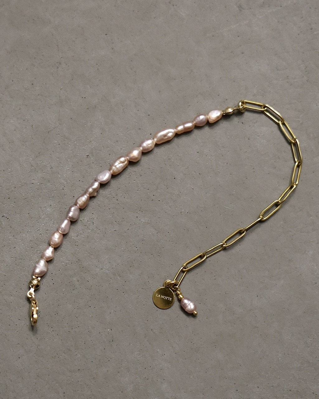 Bransoleta Rosy to połączenie niewielkich różowych pereł o nieregularnym kształcie z łańcuszkiem o płaszczonych ogniwach. Długość regulowana dzięki możliwości zapięcia w dowolnym miejscu.