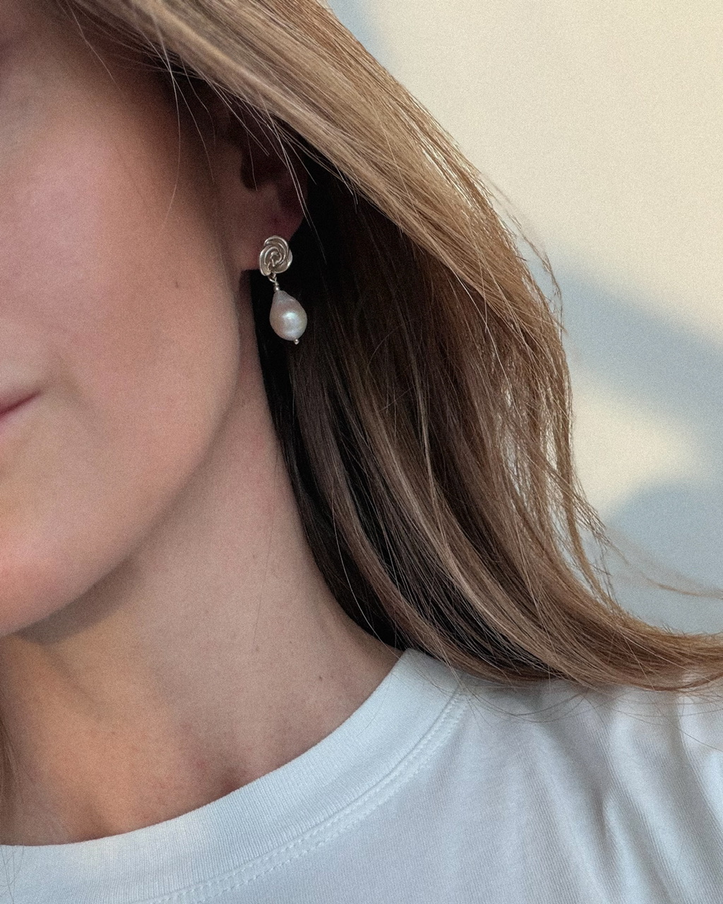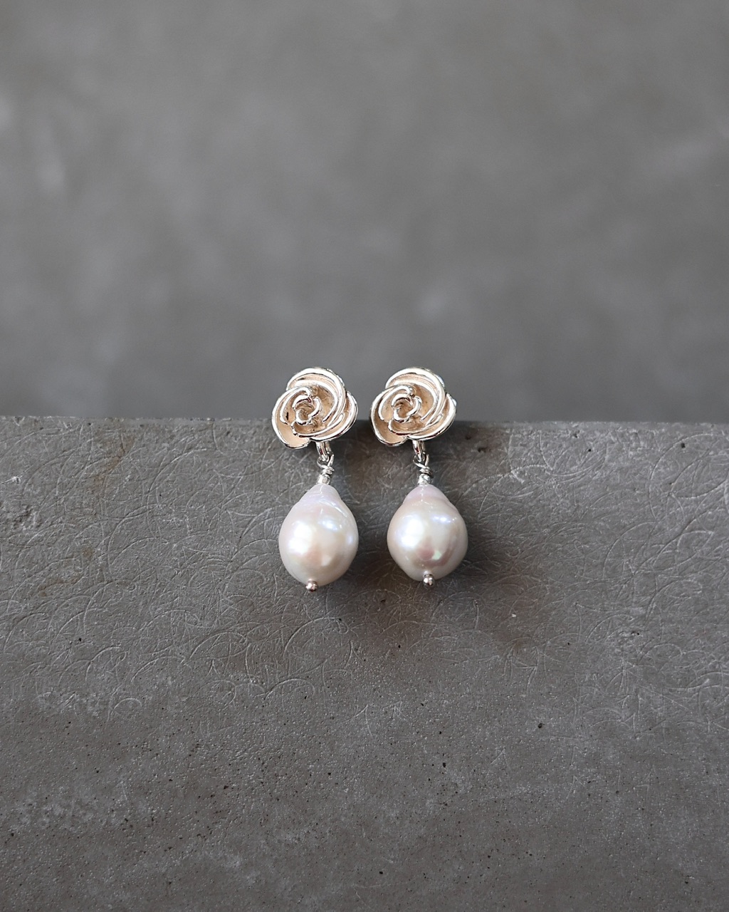 Kolczyki z naturalnymi perłami o lekko nieregularnym kształcie, zakończone subtelnym motywem róży. Połączenie średniej wielkości barokowej perły z delikatnym detalem nadaje im wyjątkowego, romantycznego charakteru. Idealne na specjalne okazje, ale także jako stylowy akcent do codziennych stylizacji. Ponadczasowa biżuteria dla miłośniczek naturalnego piękna.