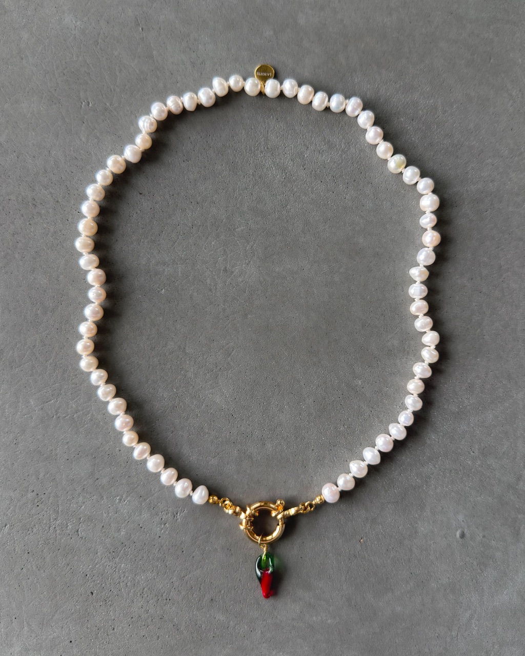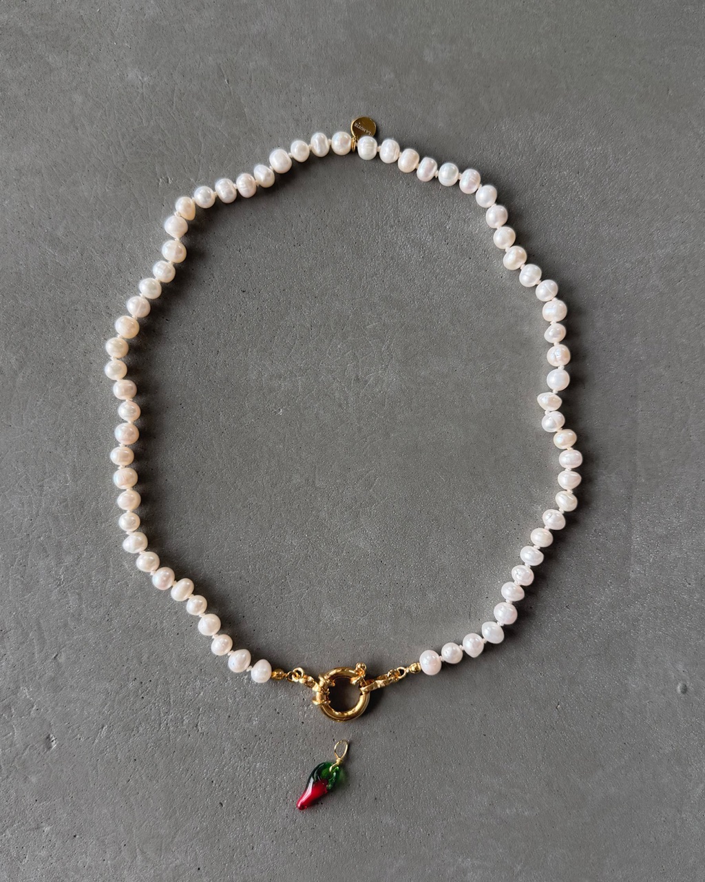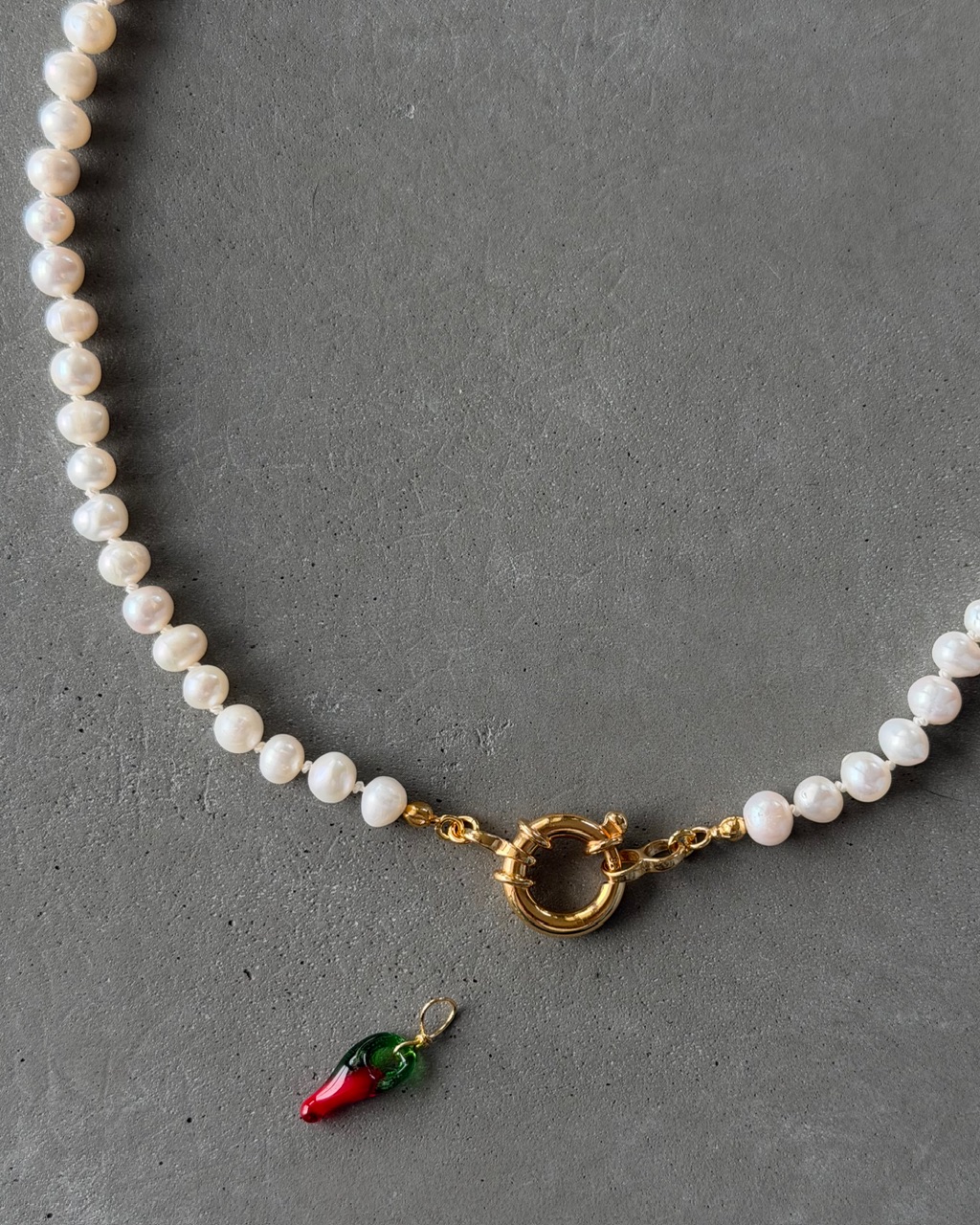 Klasyczny naszyjnik wykonany z okrągłych, lekko płaszczonych pereł z zawieszką w kształcie papryczki. Idealny do codziennych i wieczorowych stylizacji. Pięknie wygląda samoistnie i w towarzystwie innej biżuterii.