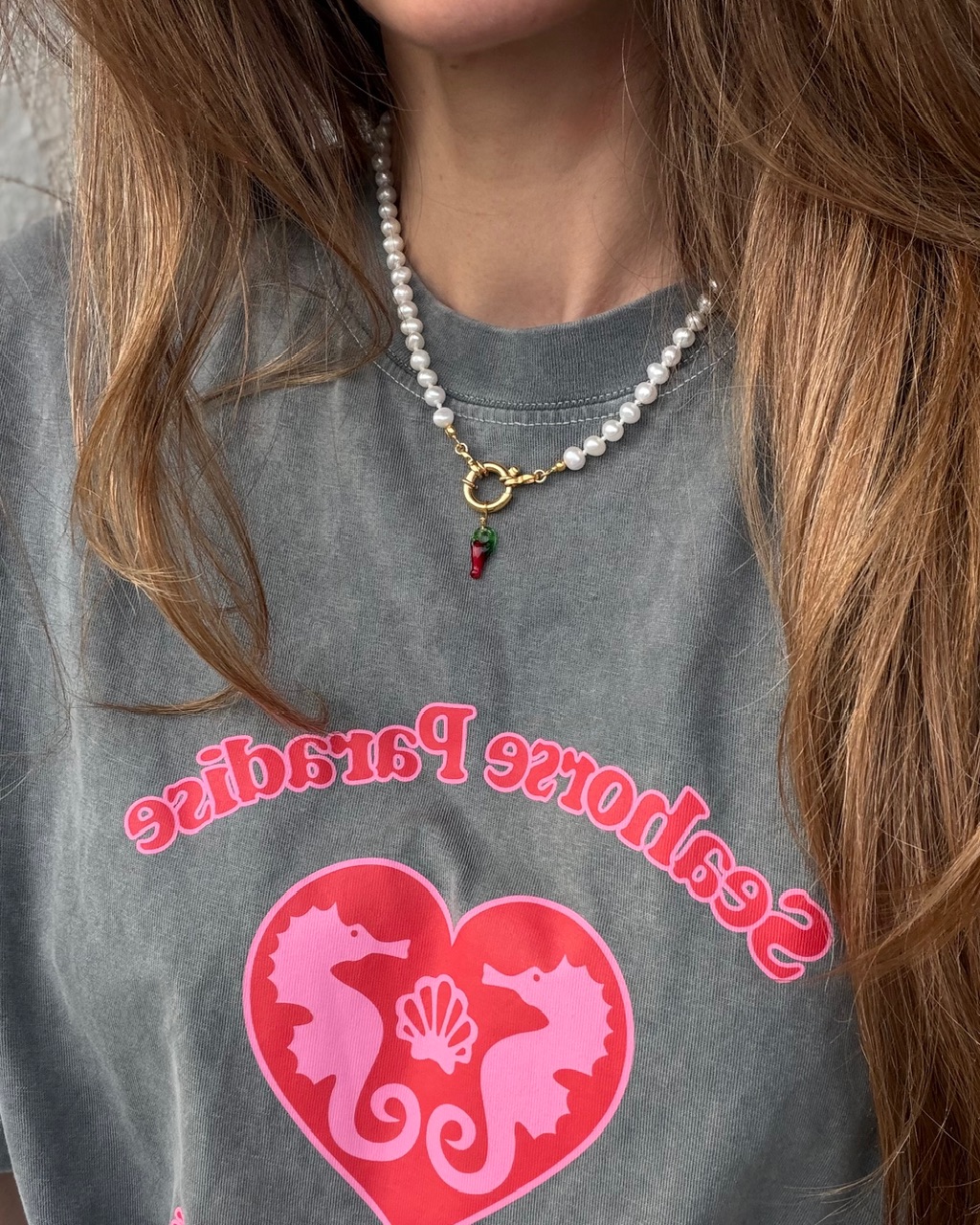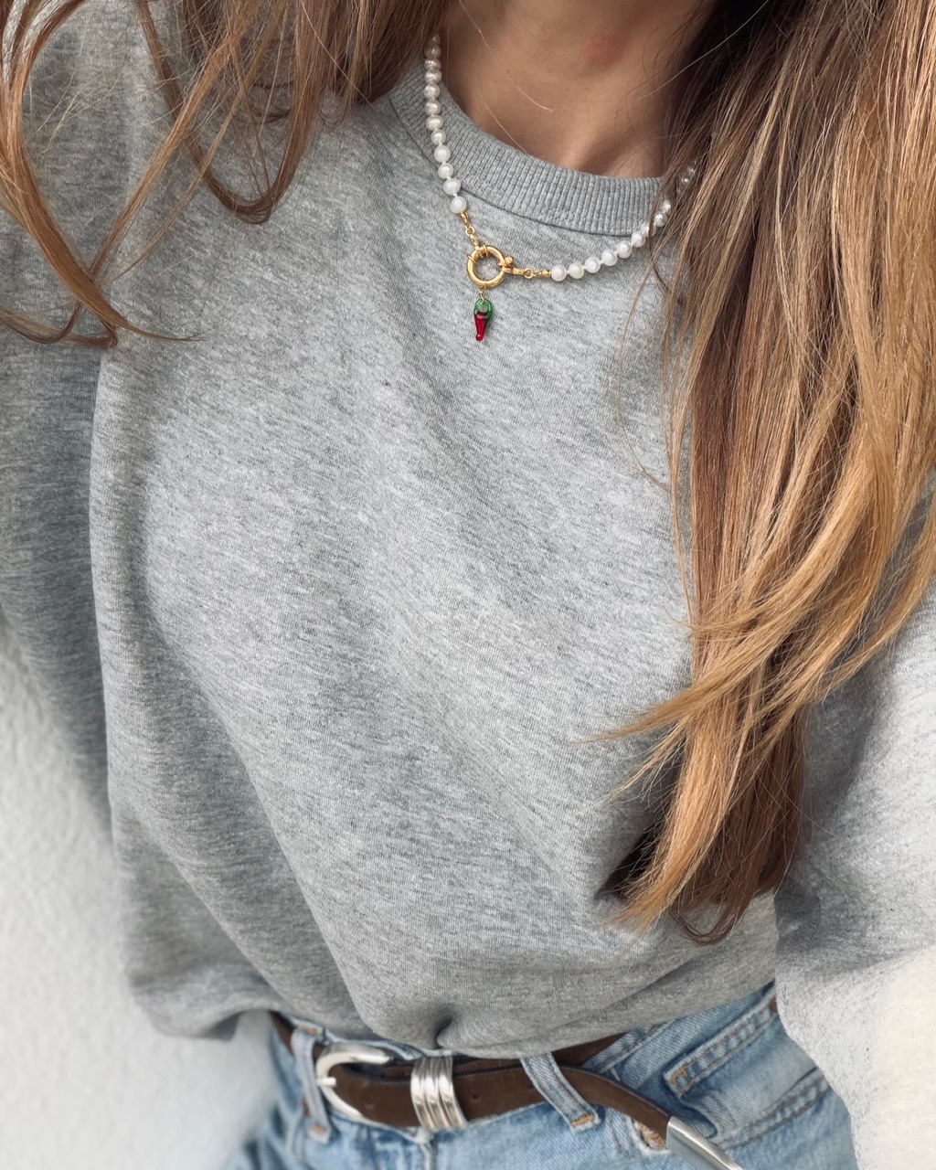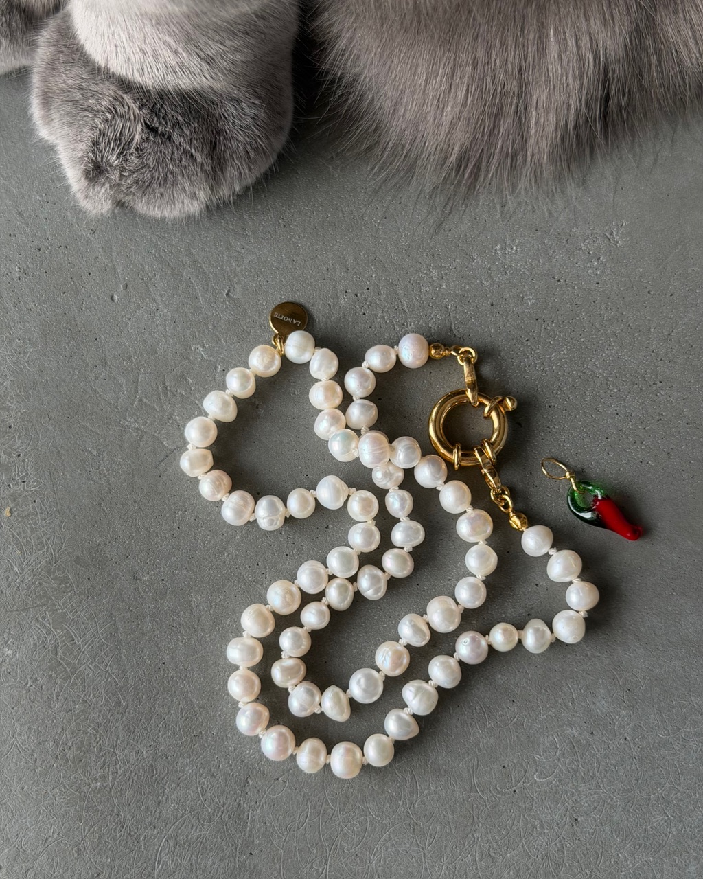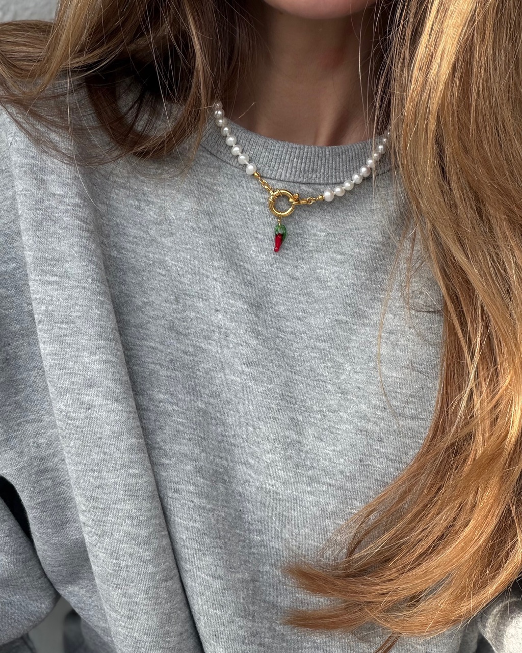 Klasyczny naszyjnik wykonany z okrągłych, lekko płaszczonych pereł z zawieszką w kształcie papryczki. Idealny do codziennych i wieczorowych stylizacji. Pięknie wygląda samoistnie i w towarzystwie innej biżuterii.