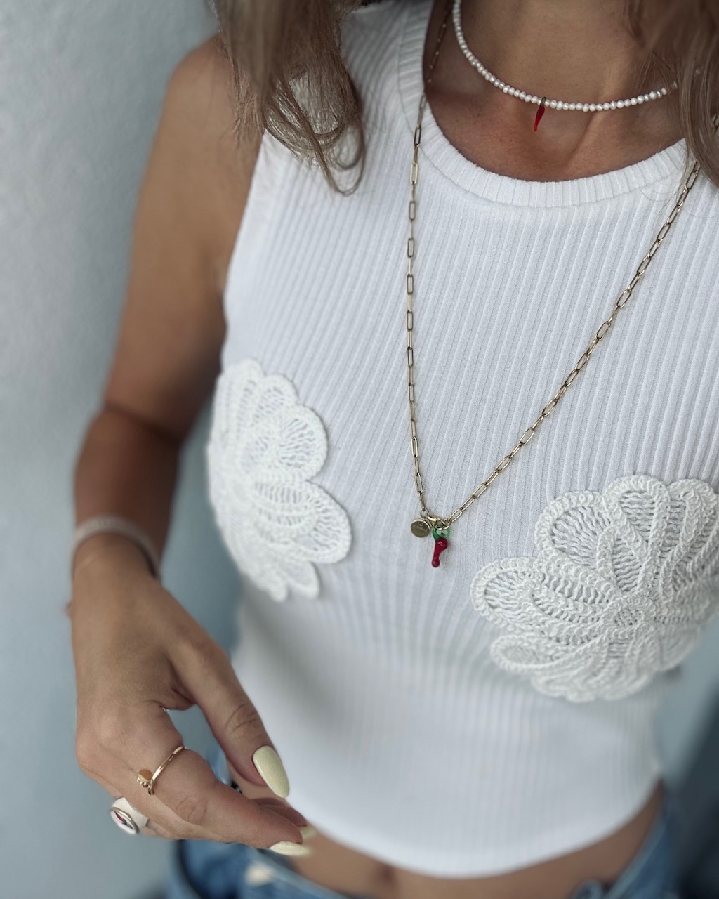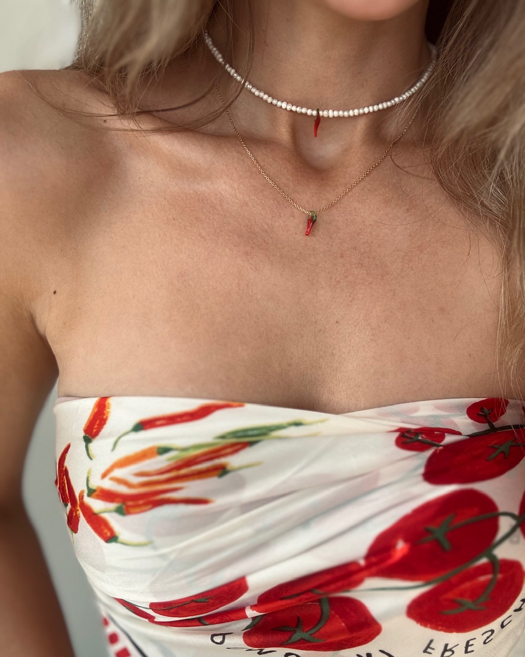 Delikatny naszyjnik wykonany z okrągłych pereł z zawieszką w kształcie papryczki. Idealny do codziennych i wieczorowych stylizacji. Pięknie wygląda samoistnie i w towarzystwie innej biżuterii.
