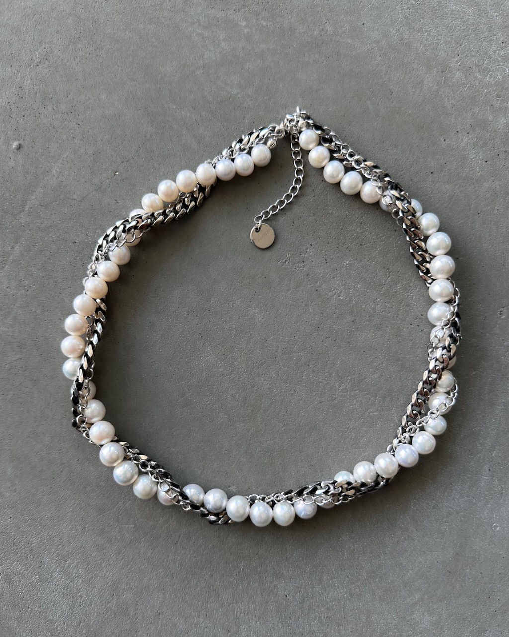 Naszyjnik Twist Me to okrągłe perły oplecione dwoma łańcuszkami. Naszyjnik można nosić skręcony lub klasycznie z wiszącymi łańcuszkami. Najładniejszy skręt otrzymujemy, gdy naszyjnik założymy blisko szyi – jako choker.